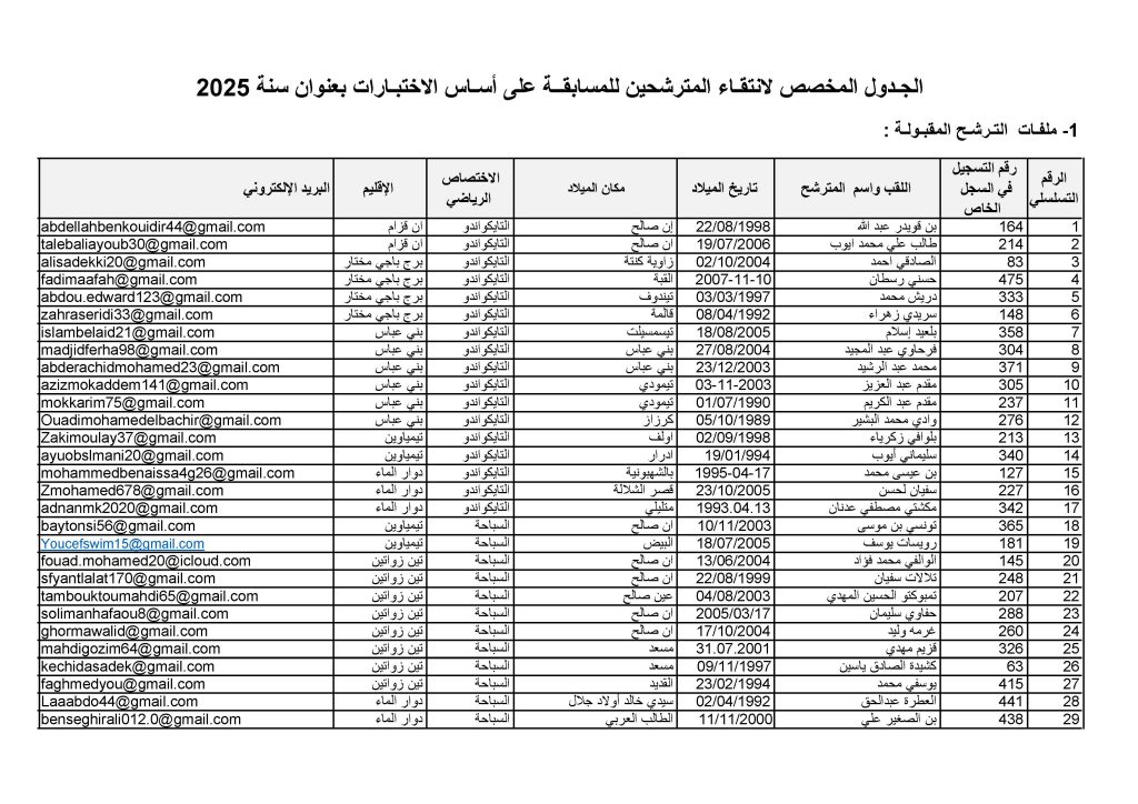 القائمة النهائية للمترشحين المرفوضين في المسابقة على أساس الاختبارات بعنوان 2025 adminمارس 10, 2026مارس 10, 2026 القائمة النهائية للمترشحين الناجحين في المسابقة على أساس الاختبارات للالتحاق بالتكوين المتخصص بعنوان سنة 2025 الرتبة : مربي... adminأغسطس 5, 2025أغسطس 5, 2025 قائمة المترشحين المرفوضة ملفاتهم لاجتياز المسابقة على اساس الاختبارات المعتمدة من قبل اللجنة بعد الدراسة الطعون للالتحاق بالتكوين المتخصص بعنوان سنة 2025 – الرتبة : مربي الأنشطة البدنية والرياضية adminيوليو 13, 2025يوليو 13, 2025